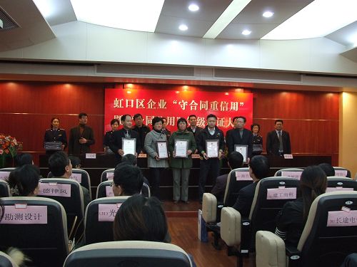 上海虹口区合同信用促进会组织开展的2006——2007年度企业合同信用评价工作日前圆满结束,并召开授证大会,上海市虹口区区长包建强、区工商行政管理局局长于勇、虹口区合同信用促进会副会长、上海中科电气集团董事长兼总裁陈庆钱等有关领导出席。我公司再次荣获合同信用AAA级企业,这是继2001年开展此活动以来,已连续五年获此殊荣。